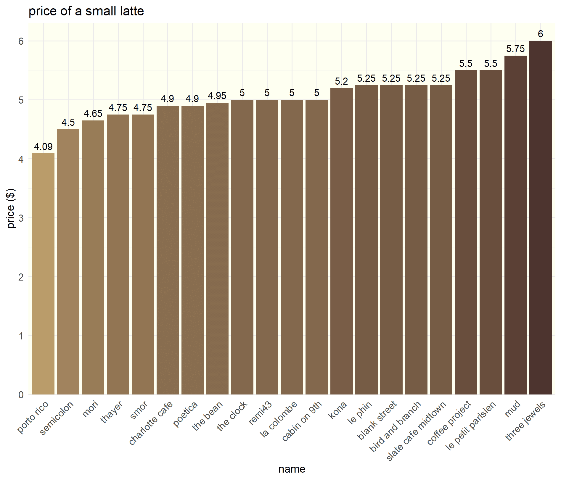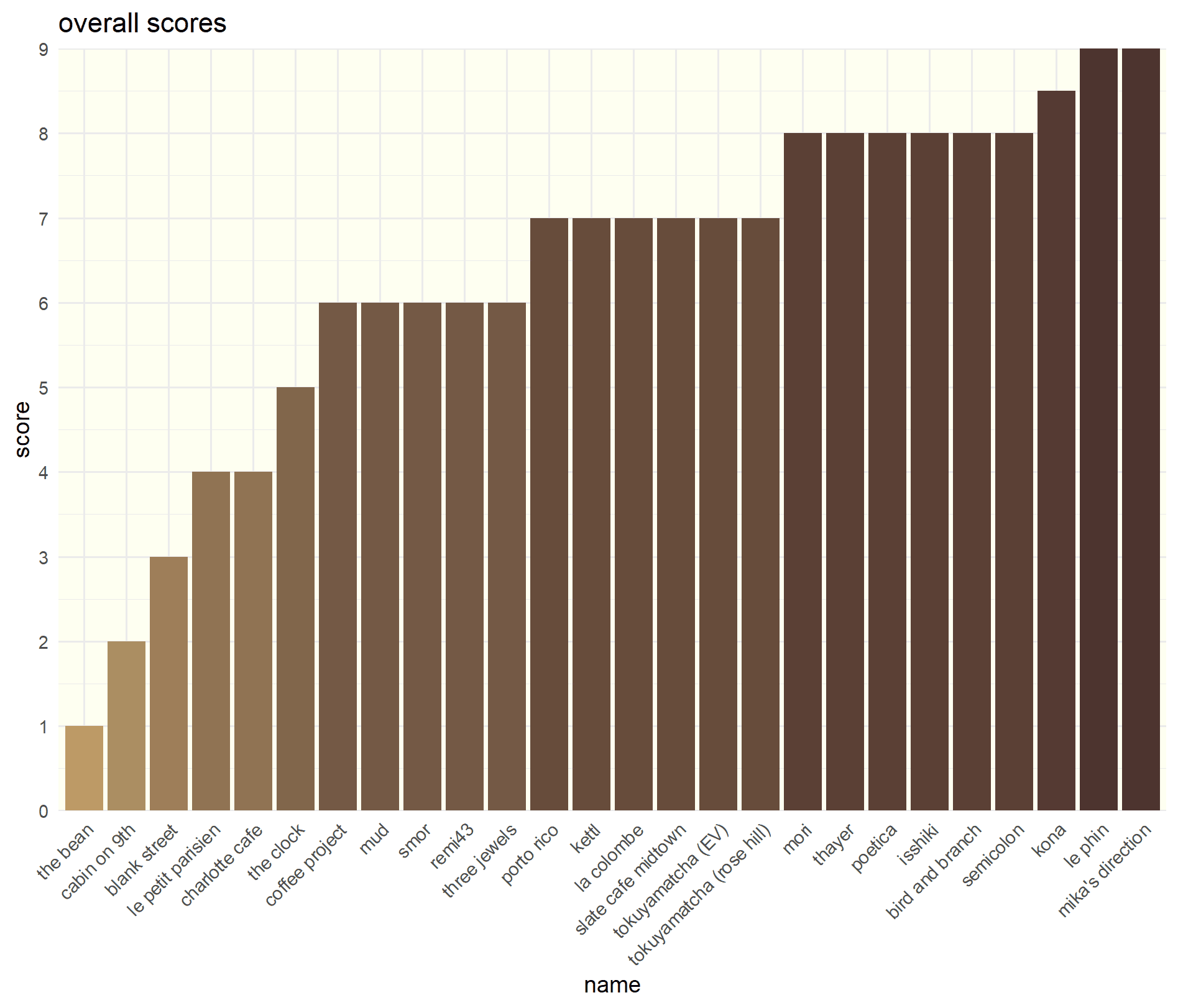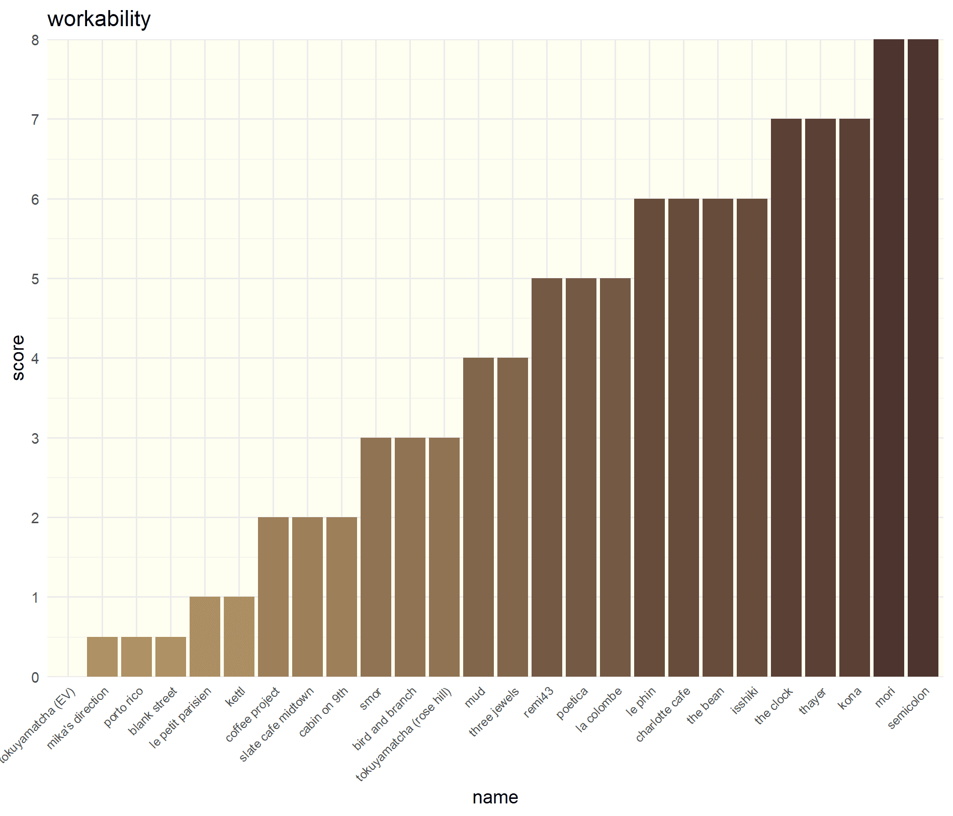 DESIGNED A WEBSITE FEATURING CHARTS AND NOTES DOCUMENTING NYC CAFES I'VE EXPLORED AS A STUDENT. THIS PROJECT IS INTENDED FOR ME TO KEEP MYSELF SHARP WITH USING R AND GIVING RECOMMENDATIONS!